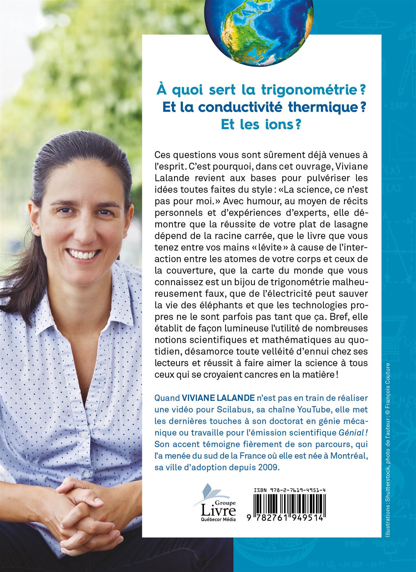 Ces questions vous sont sûrement déjà venues à l'esprit. C'est pourquoi, dans cet ouvrage, Viviane Lalande revient aux bases pour pulvériser les idées toutes faites du style: «La science, ce n'est pas pour moi.» Avec humour, au moyen de récits personnels et d'expériences d'experts, elle démontre que la réussite de votre plat de lasagne dépend de la racine carrée, que le livre que vous tenez entre vos mains «lévite» à cause de l'interaction entre les atomes de votre corps et ceux de la couverture, que la carte du monde que vous connaissez est un bijou de trigonométrie malheureusement faux, que de l'électricité peut sauver la vie des éléphants et que les technologies propres ne le sont parfois pas tant que ça. Bref, elle établit de façon lumineuse l'utilité de nombreuses notions scientifiques et mathématiques au quotidien, désamorce toute velléité d'ennui chez ses lecteurs et réussit à faire aimer la science à tous ceux qui se croyaient cancres en la matière!